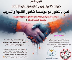 صرح المستشار فاروق شاهين رئيس مركز شاهين لفرسان التحدي للتدريب والتعليم عن عقد اجتماع للإعلان عن إنطلاق اول دورة تدريبية بالتعاون مع حملة 15 مليون معاق فرسان الإرادة مخصصة لأبناء الحملة.